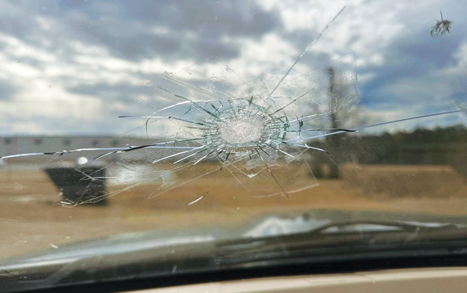 Scary Moment Mrs. Jacey Braun posted these photos on Facebook after bullet last Friday afternoon struck her windshield while she was driving into Blackstone with her two toddlers. Part of the bullet entered truck she was driving and came to rest on dashboard (see smaller photo in today’s lead story). Left photo was taken inside vehicle; right photo was taken outside.