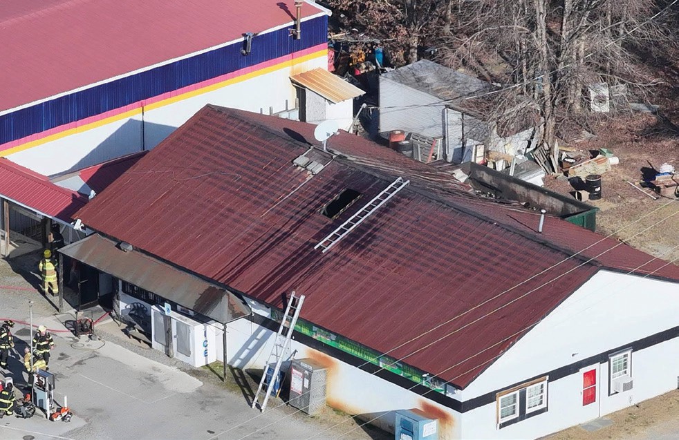 Started At Rear Of Store These photos on Blackstone Vol. Fire Department’s Facebook page show Spainville Store before units arrived on scene (upper left) and during firefighting operations (upper right). Bottom photos show store’s rear exterior, where, firefighters say, a nearby dumpster caught fire and flames spread to the rear awning and roof.