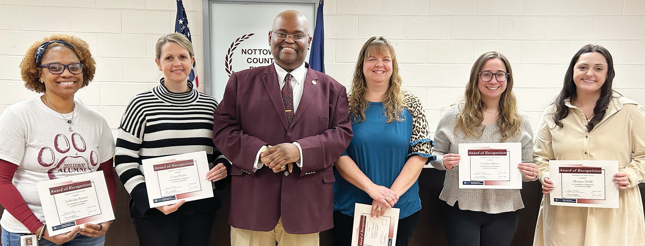 Nottoway’s school counselors were honored for their service at Thursday night’s School Board meeting, which occurred one week after National School Counseling Week. FROM LEFT: LaNeisha Barner of Nottoway High, Casey Boyles of Nottoway Middle, Board Chairman Damien Rowe, Angie Dumond of Blackstone Primary, Caitlin Adams of Crewe Primary, and Morgan Duffy of Nottoway Intermediate. NOT PRESENT: counselor Jonathan Staylor of Nottoway High.