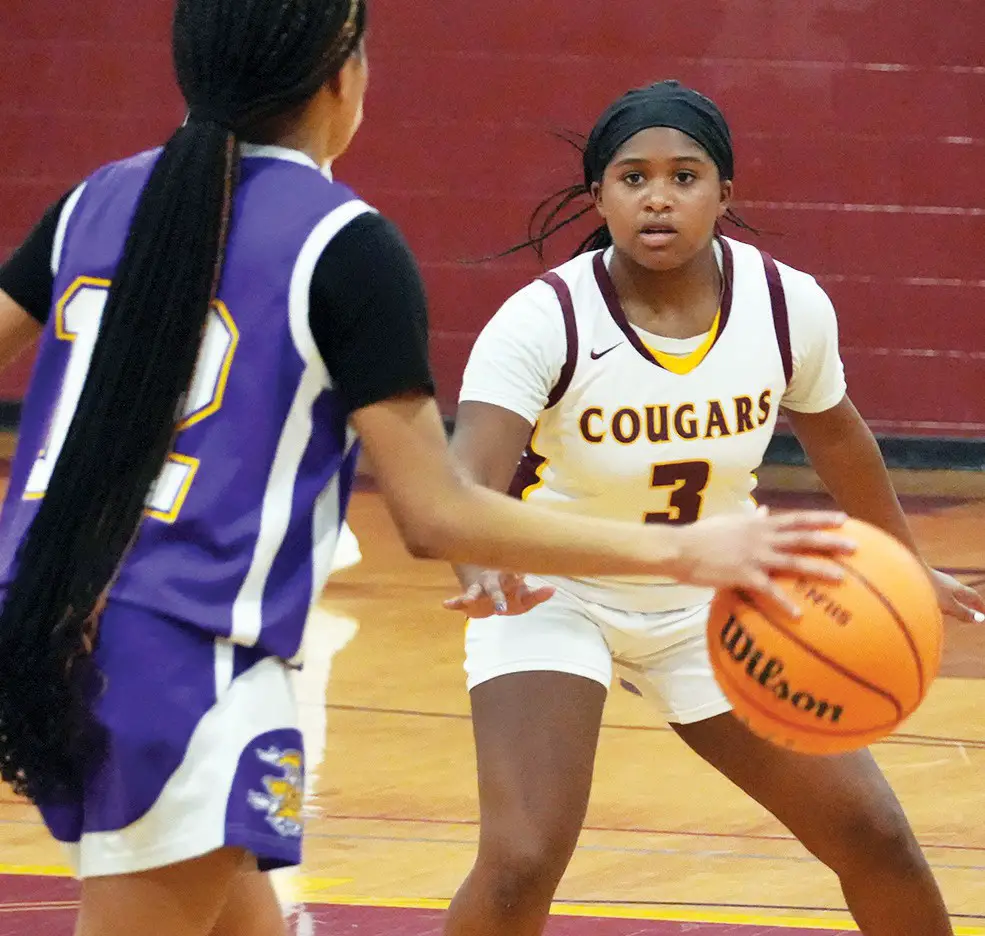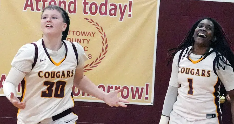 Ice In Her Veins Nottoway Lady Cougar freshman Alex Shelton (left) celebrates her late game threepointer as teammate Janaria Stokes (#1) smiles in jubilation. Nottoway’s JV girls beat Central of Lunenburg, 36-32, in James River District Championship game Wednesday.