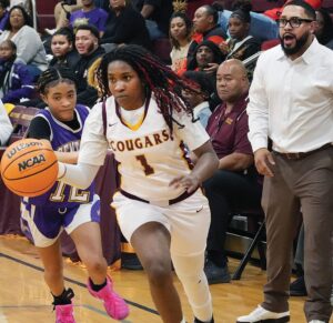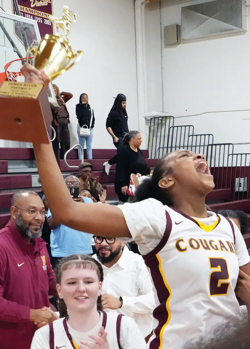 JV Girls’ Glory! Nottoway’s NaVonya Wright (#2) hoisted the trophy after 36-32 victory over Lunenburg. Janaria Stokes (#1) drove to the hoop in 4th quarter as an excited Head Coach Johnny Coombs watched closely. JV Lady Cougar guard Jayden Banks (#3) made three steals. “She’s a major part of this championship team, and her leadership and contributions throughout the season were vital to our success.”