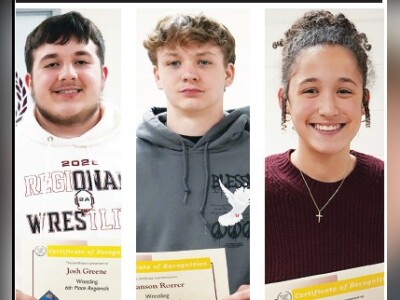 Several student-athletes of Nottoway High School were recognized at the School Board’s March 12th meeting. Among them from left were All-Region wrestlers Josh Green and Branson Rorrer and Livia Lee, 1st Team All-District in varsity girls’ basketball.